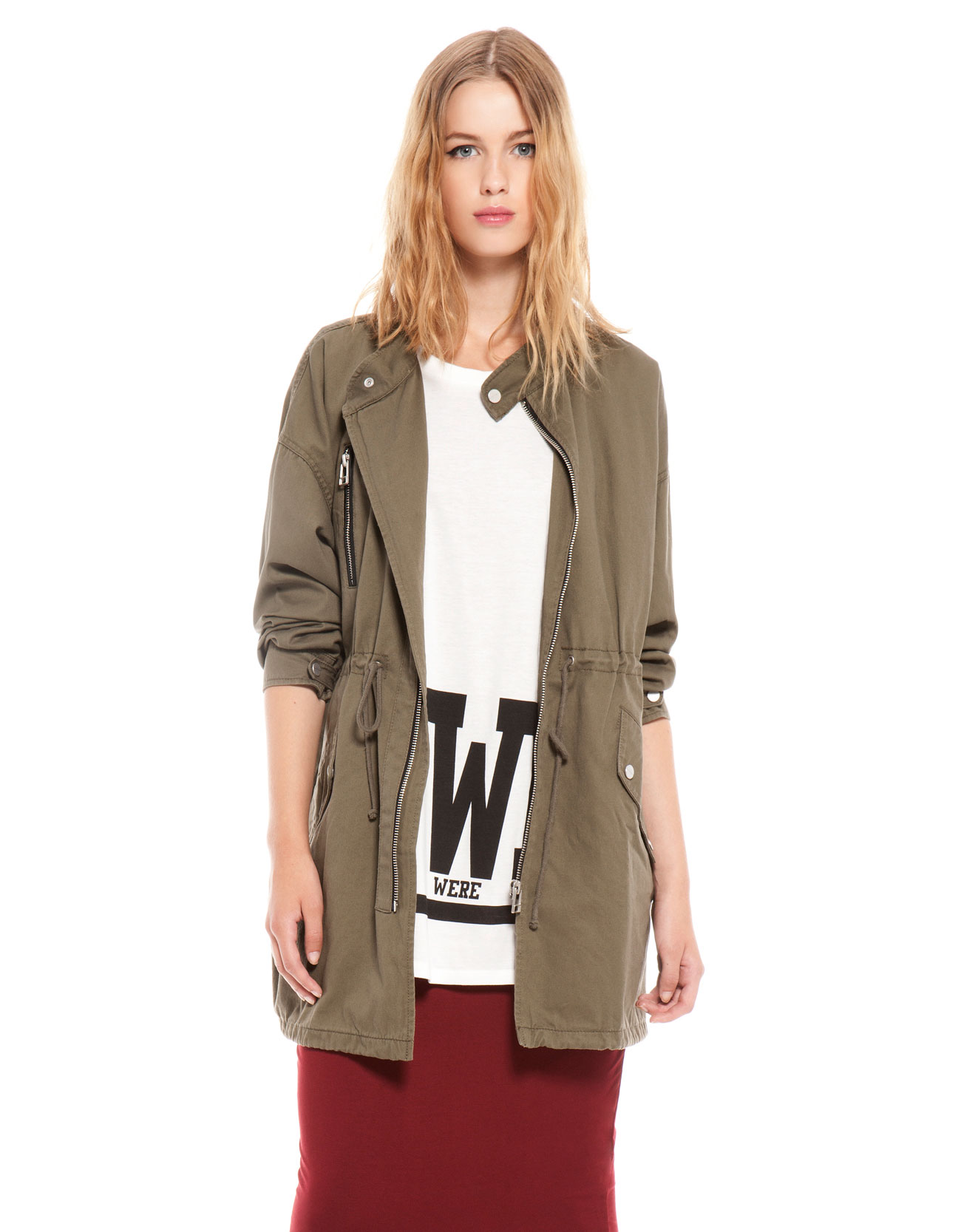 En encontraremos de todo tipo, con capucha, con bolsillos grandes, diferentes tamaños, ... eso sí, siempre de color verde militar. Se puede combinar con vestidos, pantalones, leggings, con tacones o zapato plano, ...